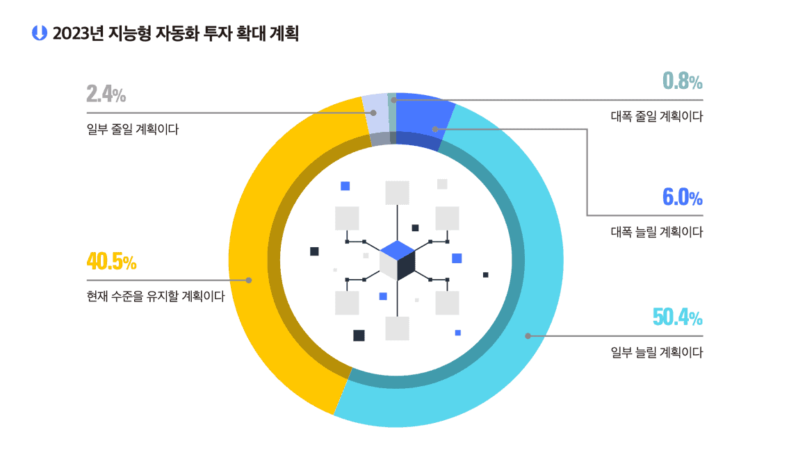 또한, 조사 결과에서 국내 기업 중 절반에 가까운 47.5%가 RPA를 도입해서 활용하고 있는 가운데, 향후 1년 내 도입 계획을 밝힌 기업은 10.7%, 도입을 고려 중인 기업도 33.2%로 나타났다. 이어서 향후 1년 간의 RPA 투자 계획을 묻는 질문에는 50.4%가 RPA에 대한 투자를 늘릴 것이라고 대답했으며, 40.5%는 현재 수준을 유지할 계획이라고 답했다.