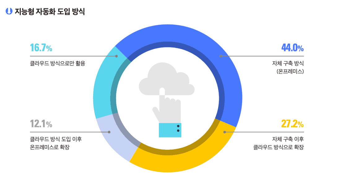 한편, 현재 국내 기업의 RPA 환경은 온프레미스 환경이 44.0%, 클라우드 환경은 16.7%의 비율을 이루는 것으로 나타났다. 온프레미스와 클라우드를 모두 활용하는 방식은 39.3%를 차지하며 일부라도 클라우드를 활용하는 환경은 총 56.0%다. 이제 막 RPA 활용을 시작해 특정 부서 일부 기능에 시험적으로 도입한 기업은 자체구축방식의 비중이 39.1%로 평균 이하이고, 클라우드 방식으로만 활용한다는 응답은 18.8%로 평균보다 높다. 도입을 고려 중인 기업 중에서는 25.1%가 클라우드 방식으로만 활용할 것이라고 답했다.