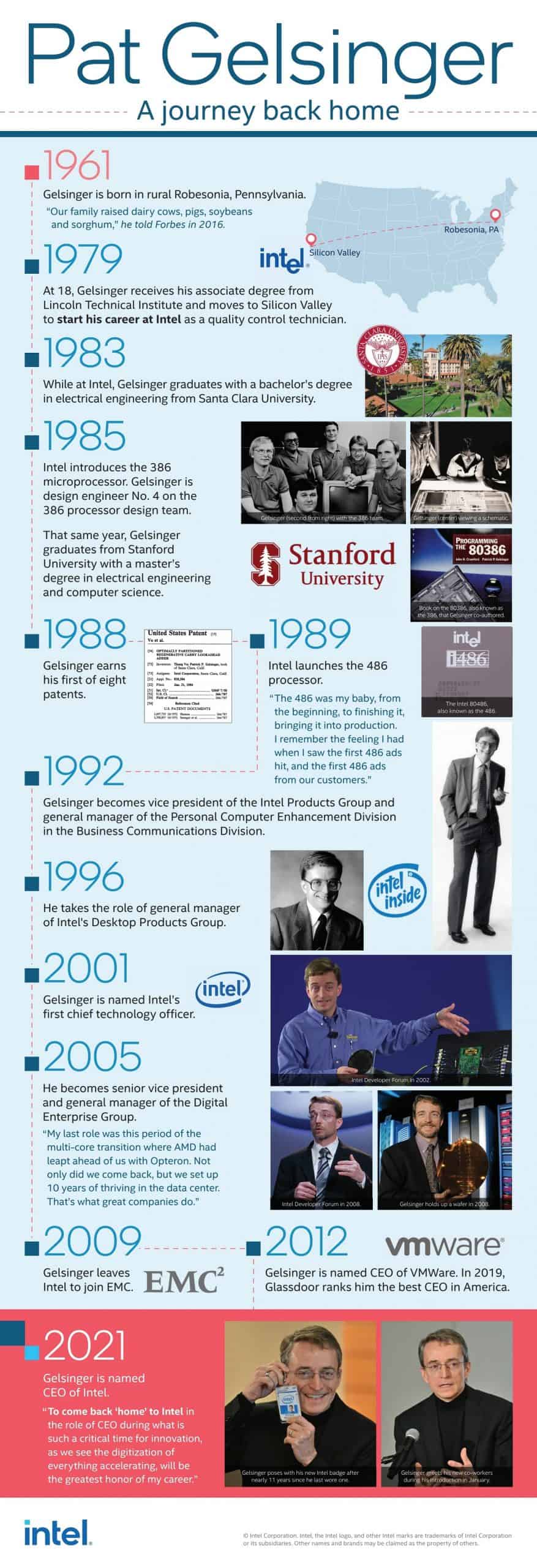 팻 겔싱어는 1979년 인텔 입사했으며, 이후 인텔의 첫 최고 기술 책임자(CTO)가 되어, 수석 부사장 겸 디지털 엔터프라이즈 그룹의 총괄을 역임했으며, USB 및 와이파이(Wi-Fi)와 같은 주요 산업 기술 개발을 주도했다. 그는 오리지널 80486 프로세서 아키텍트로서 14개의 서로 다른 마이크로프로세서 개발을 이끌었으며, 인텔 코어(Core®) 및 제온(Xeon®) 프로세서 제품군 개발에서 중추적 역할을 맡았다. 그로 인해 인텔은 뛰어난 마이크로프로세서를 공급할 수 있었다.