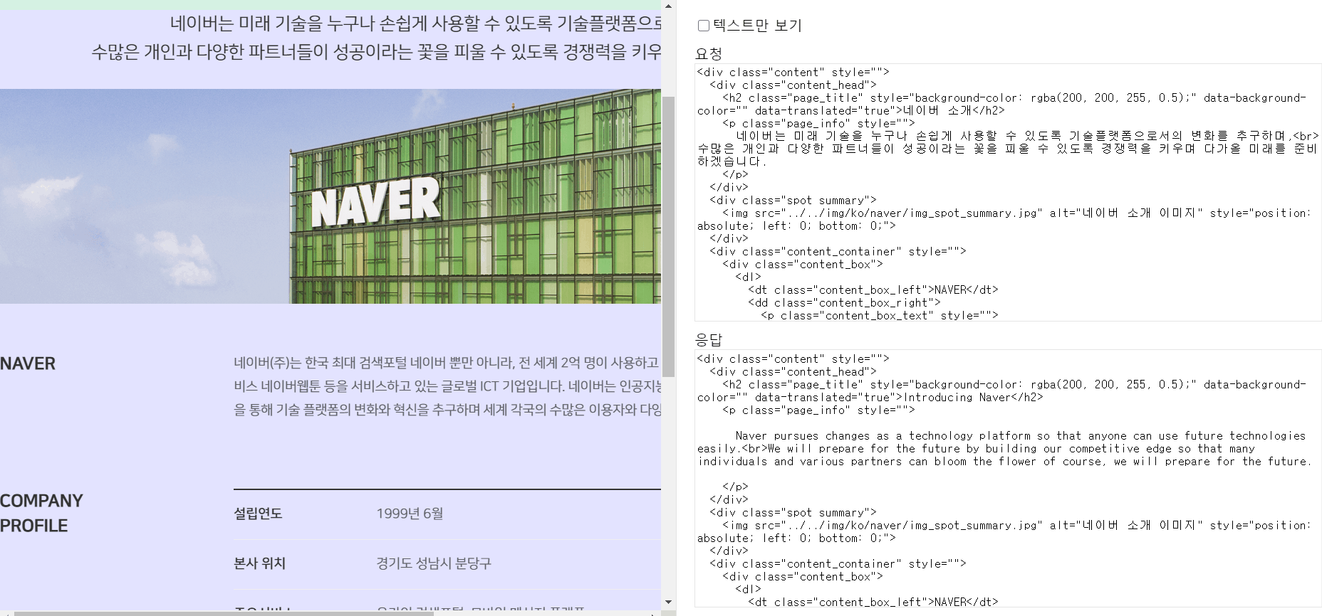 ‘웹 번역 API’는 웹페이지 내 소스 언어로 작성된 HTML 문서를 파파고만의 태그 복원 기술을 반영해 원하는 언어로 번역해준다. HTML 소스 내에 태그와 문장을 분리한 후 발췌된 문장 내용만 번역하고, 완성된 번역결과를 다시 HTML 태그와 조합하여 완성된 형태의 HTML로 보여준다.
