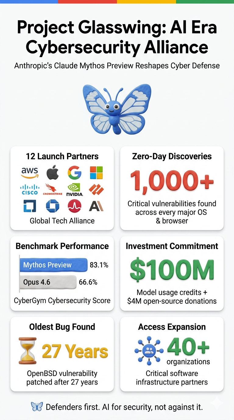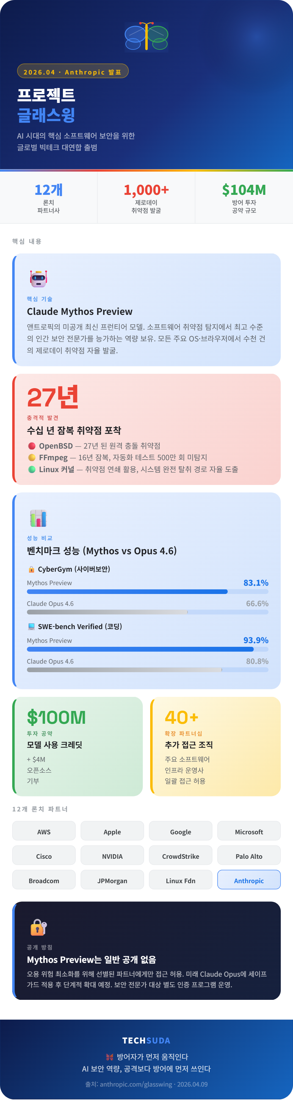 ▶ 앤쓰로픽이 AWS·애플·구글·마이크로소프트 등 12개 글로벌 빅테크와 함께 '프로젝트 글래스윙(Project Glasswing)'을 출범하며 AI 시대 사이버보안 대연합을 발족했다.