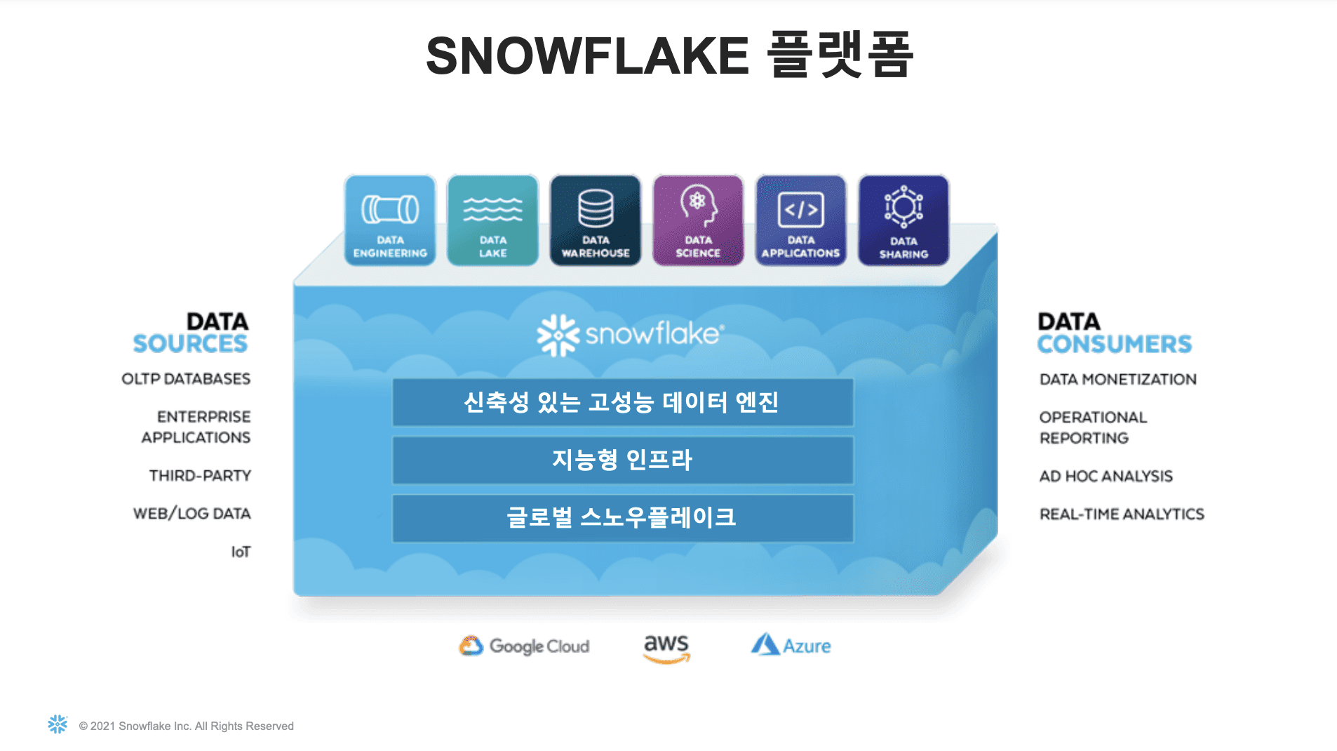 스노우플레이크는 처음부터 아마존웹서비스(AWS), 마이크로소프트 애저(Microsoft Azure) 인프라를 기반으로 만든 데이터 플랫폼으로 기업 고객들이 다양한 클라우드 사업자와 일할 때 분산된 데이터를 하나의 화면에서 쉽게 통합해 활용할 수 있도록 제공했다. 이를 통해 특정 클라우드 사업자 인프라에 락인되는 걸 방지하면서 동시에 통합 데이터 플랫폼을 가질 수 있는 장점으로 인해서 급성장 중이다.