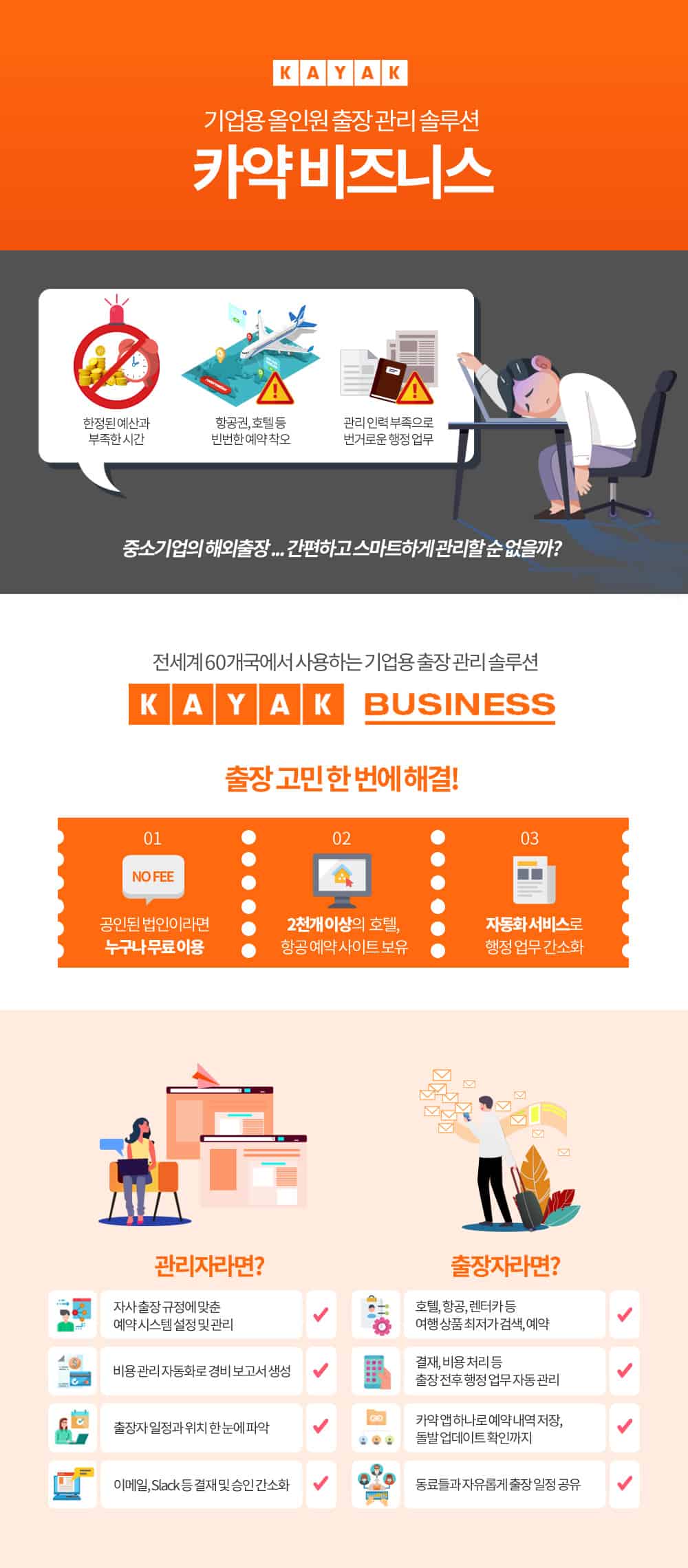 기업용 출장 관리 솔루션 카약 비즈니스(KAYAK Business)는 항공편, 호텔, 렌터카 등 다양한 상품을 쉽고 빠르게 예약해 효율적으로 출장을 계획할 수 있도록 돕는다. 카약은 자사 계열사인 호텔스컴바인의 호텔 상품군을 포함해 수백 개 이상의 예약 사이트를 보유하고 있는 여행 플랫폼이다. 카약 비즈니스는 여기에 기업용 특가 등의 추가 혜택과 사용자 편의 서비스를 더한 카약의 비즈니스 버전이다.