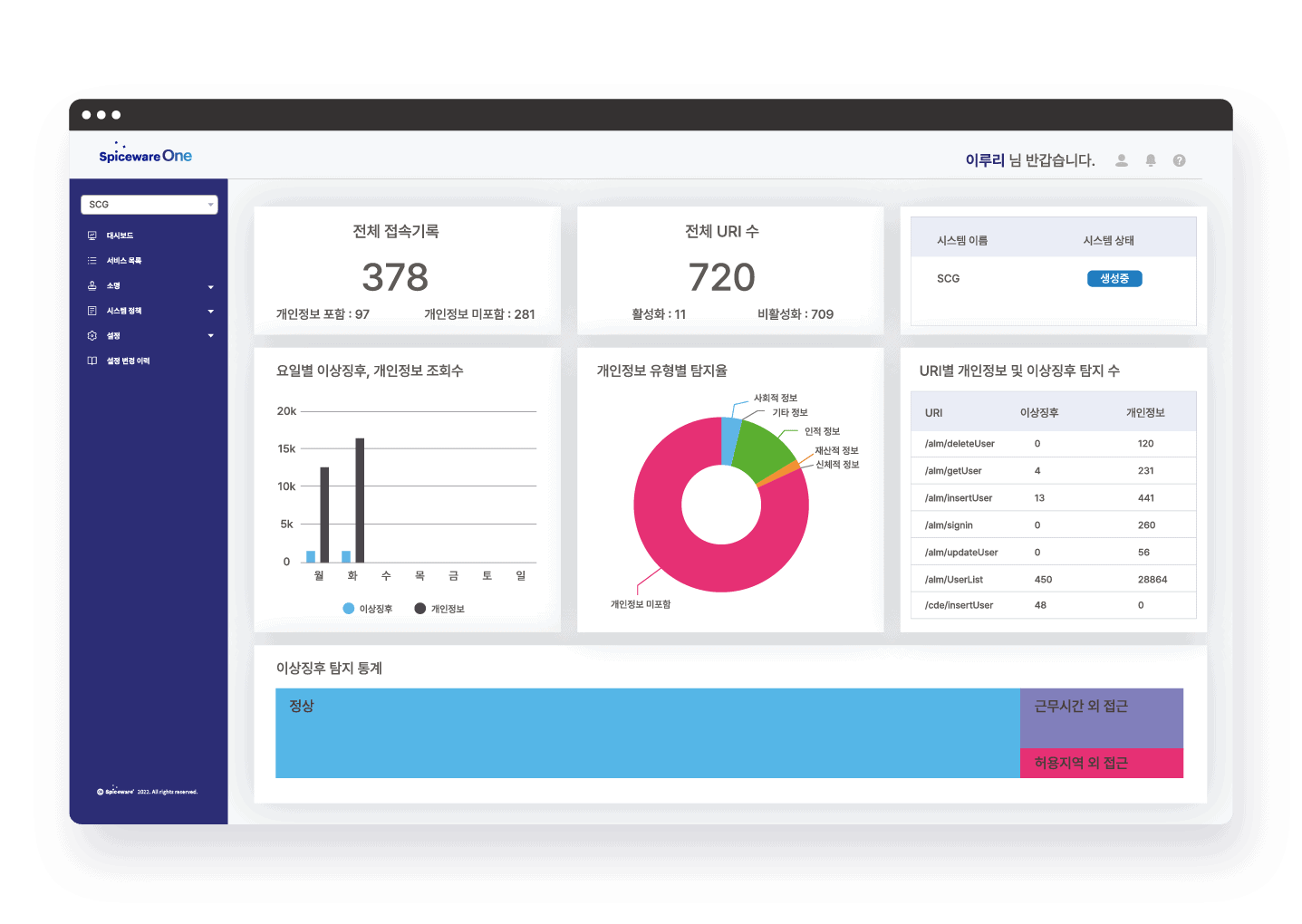 스파이스웨어 원은 특히, 보안 클라우드 게이트웨이(Secure Cloud Gateway)를 활용해 코딩 없이 서비스 변경 영향을 최소화하고 클라우드 전환 시 인프라 환경 변화로 발생할 수 있는 데이터 보안 허점을 원천 차단한다. 또한, 개인정보를 자동으로 수집・탐지・식별해 접속기록을 관리함으로써 작업시간을 단축하고 비정상적인 접근 발생 시 관리자에게 이상징후 알림으로 보안 공백을 메울 수 있다.