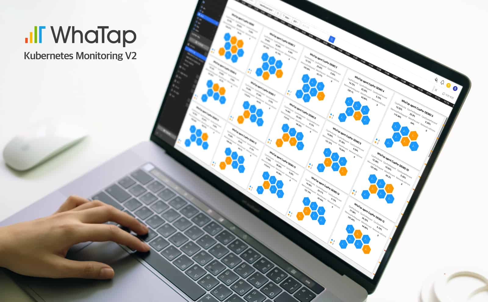 이번에 GS인증을 통과한 와탭 쿠버네티스 V2는 컨테이너부터 애플리케이션까지 통합 분석하는 국내 유일 쿠버네티스 모니터링이다. 상관 관계가 복잡한 쿠버네티스 업무 환경에서 토폴로지 기반으로 업무 흐름을 파악할 수 있고, 트랜잭션 트레이스를 통해 구간 별 문제점을 분석할 수 있다.