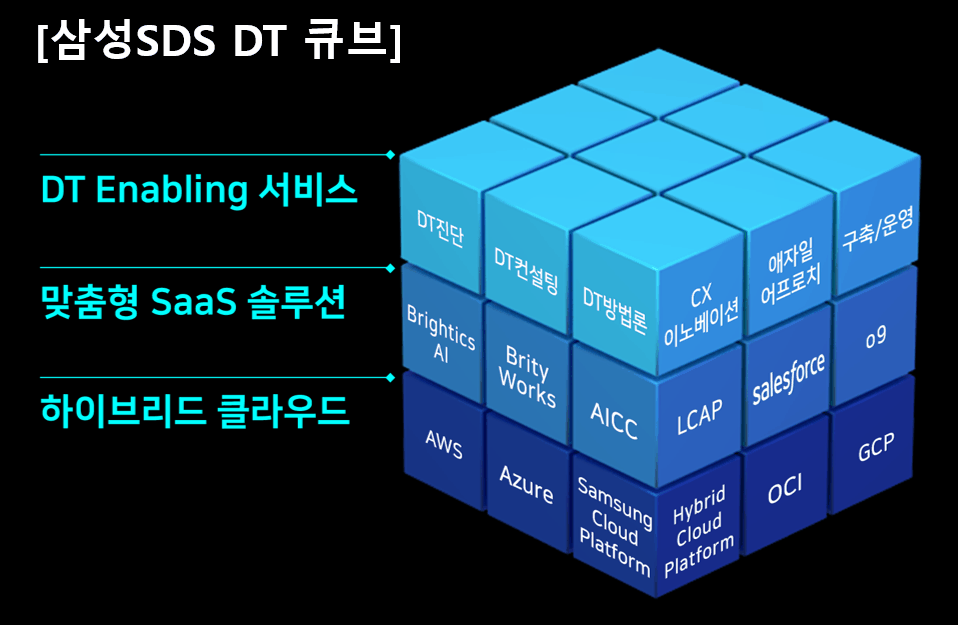또 삼성SDS는 클라우드 환경에서 DT를 실현하는 다양한 방법론을 입체적으로 표현한 DT 큐브도 소개하며, 향후 플랫폼 수준으로 발전시키겠다고 강조했다.