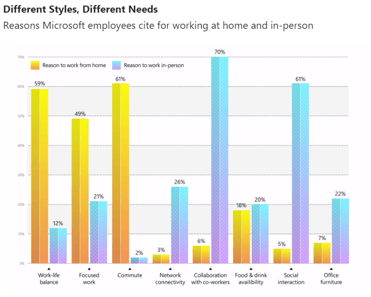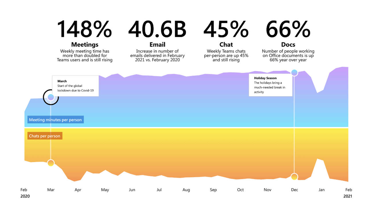 지난 1년 업무 동향 분석을 통해 원격 근무로 미팅은 2배, 이메일은 400억 개 가량 늘었다. 근로자의 73%는 원격 근무 옵션이 지속되기 원했다. 기업들의 유연 근무제 도입이 필수적이면서 동시에 근로자들이 입사와 퇴사, 그리고 근속에 큰 영향을 미칠 것으로 나타났다. 의사 결정권자 66%는 하이브리드 작업 환경을 더 잘 수용하기 위한 물리적 공간 재설계를 고려중이었다.