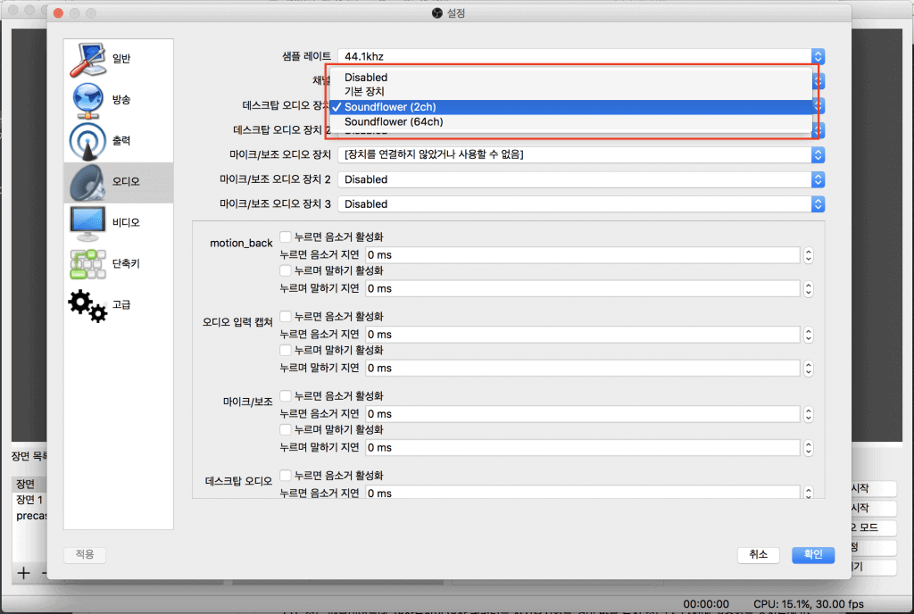 <그림 10> OBS에서 불러온 사운드플라워 가상 오디오 장치