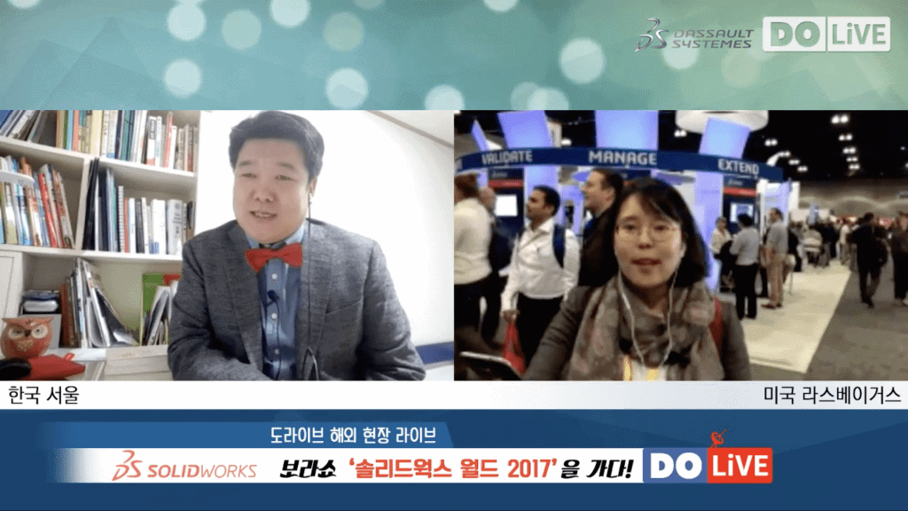 아무튼 그렇게 해서 빚어진 프로젝트가 ‘도라이브 해외 현장 라이브 : 보라쇼 ‘솔리드웍스 월드 2017’을 가다’였다. 더기어의 정보라 기자가 다쏘시스템의 연례행사인 ‘솔리드웍스 월드 2017’에 직접 방문 취재하는 걸 도라이브 쪽에서 화상통화로 연결해 소셜 라이브로 중계하는 프로젝트였다.