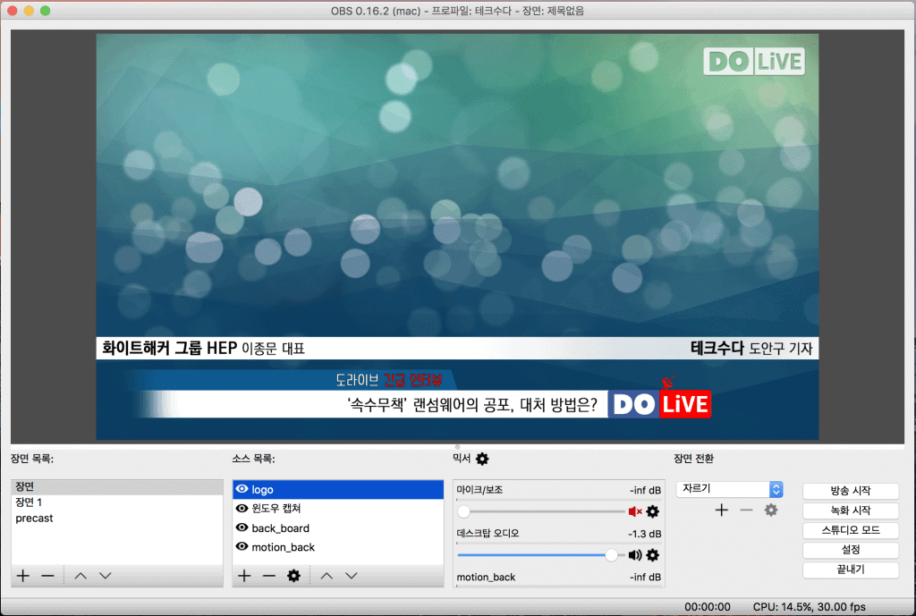 이 당시 도라이브는 OBS라는 오픈소스 소프트웨어를 사용하고 있었으며, 방송 초기였기 때문에 특별히 레이아웃도 없었다. 갈 곳 잃은 테크수다 로고만 덩그러니 박혀 있다. 심지어 방송용 로고도 아닌, 그냥 테크수다 페이스북 페이지 프로필 로고 이미지였다. 지금 다시 보니 참 부끄럽다.(삐질)