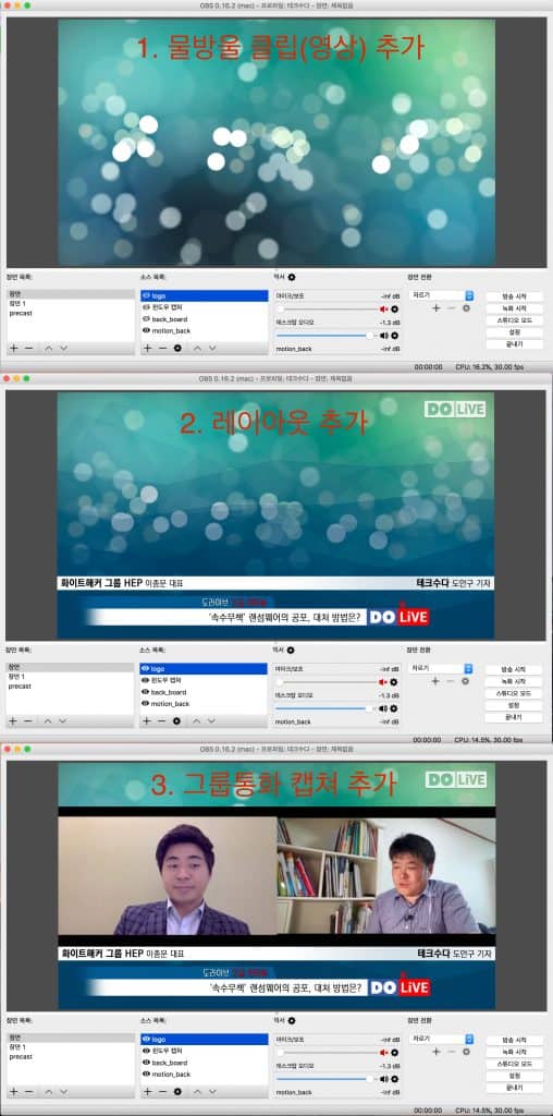 보통 인터넷 방송용 인코더 소프트웨어들은 레이어링을 할 수 있도록 구현돼 있다. 물방울이 움직이는 클립을 가장 밑에 깔고 그 위에미리 만들어 놓은 레이아웃을 올렸다. 그리고 그 위에 영화통화 화면을 크롭해 올리면 끝이다. 무료 프로그램인 OBS로도 레이어링 같은 기능은 충분히 가능하다.