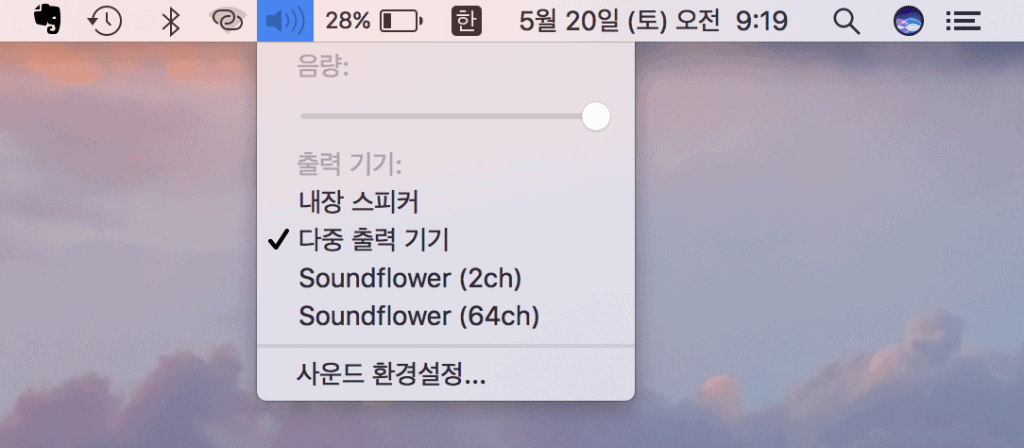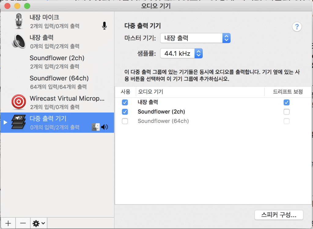 설정 방법은, 우선 맥의 ‘오디오 MIDI 설정’에서 ‘다중 출력 기기’를 생성한 후 오디오 소스를 실제 스피커(내장출력)와 사운드플라워로 동시에 내보내도록 체크(설정)한다. 그 다음 맥의 사운드 소스를 ‘다중 출력 기기’로 선택하면 된다. <그림 8>, <그림 9> 참고.