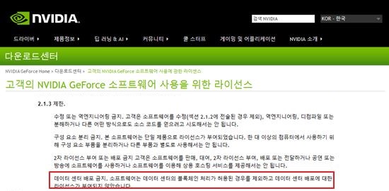 엔비디아는 지난 2017년 12월 20일 자로 자사 지포스 소프트웨어 라이선스 사용을 데이터센터에서는 고가의 기업용 그래픽 카드 사용으로 한정하고, 일반적인 게임용 그래픽카드는 블록체인 용도 외에 사용을 금지했다. 이런 이유로 월 수백만 수준에 이르는 고가의 GPU 컴퓨팅 서비스는 다수 인터넷 기업에게 많은 부담이 되어 있다.
