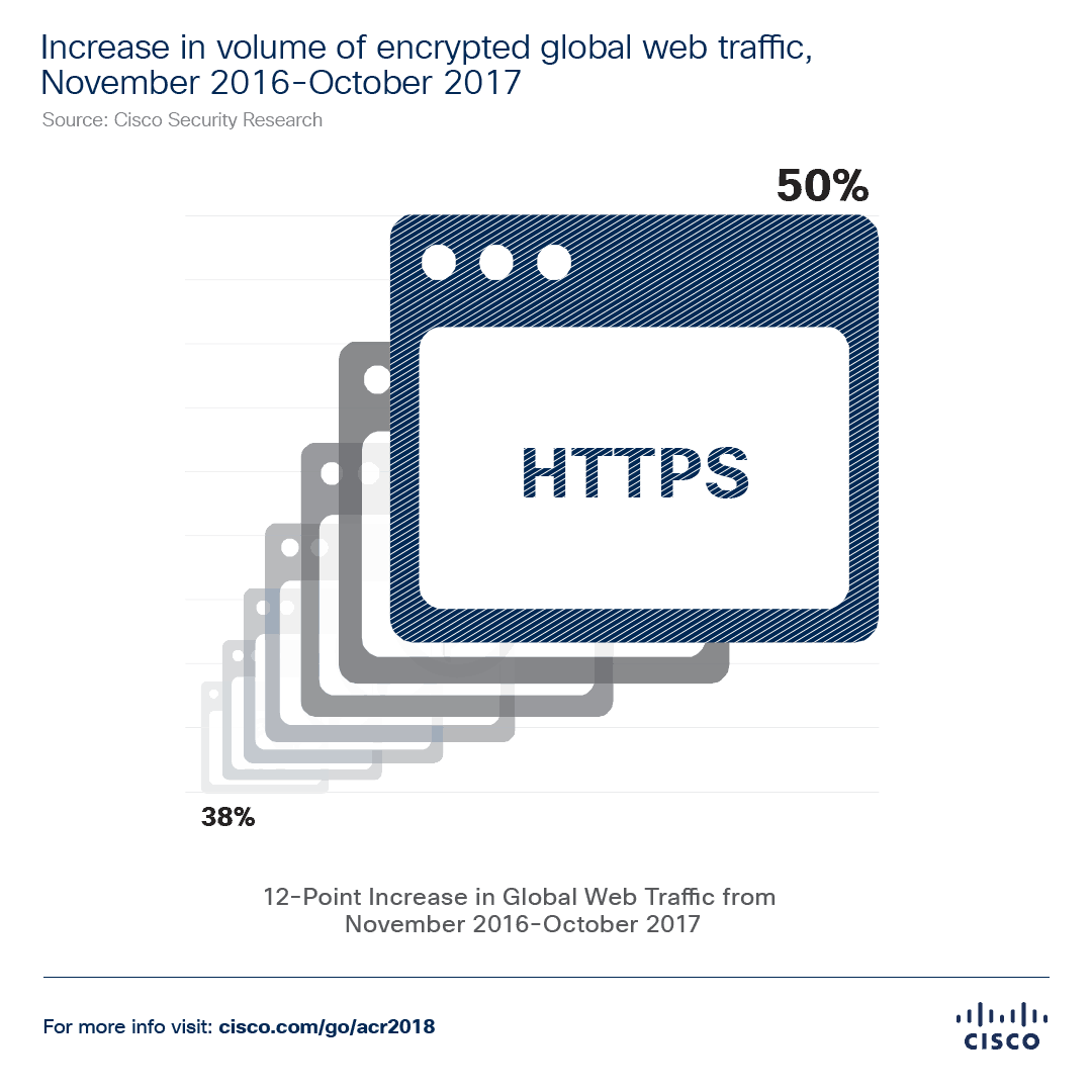 암호화는 보안 강화를 위해 고안된 기술입니다. 하지만 전체 웹 트래픽 중 합법적이든, 악의적이든 암호화된 웹 트래픽 비중이 증가하면서(2017년 10월 기준, 50%), 방어자들이 잠재적 위협을 식별하고 감시하는데 더 큰 어려움을 겪고 있습니다. 시스코의 위협 연구진에 따르면, 지난 12개월 동안 발견된 멀웨어 샘플들이 암호화된 네트워크 통신을 사용하는 비율이 3배 이상 증가한 것으로 나타났습니다.
