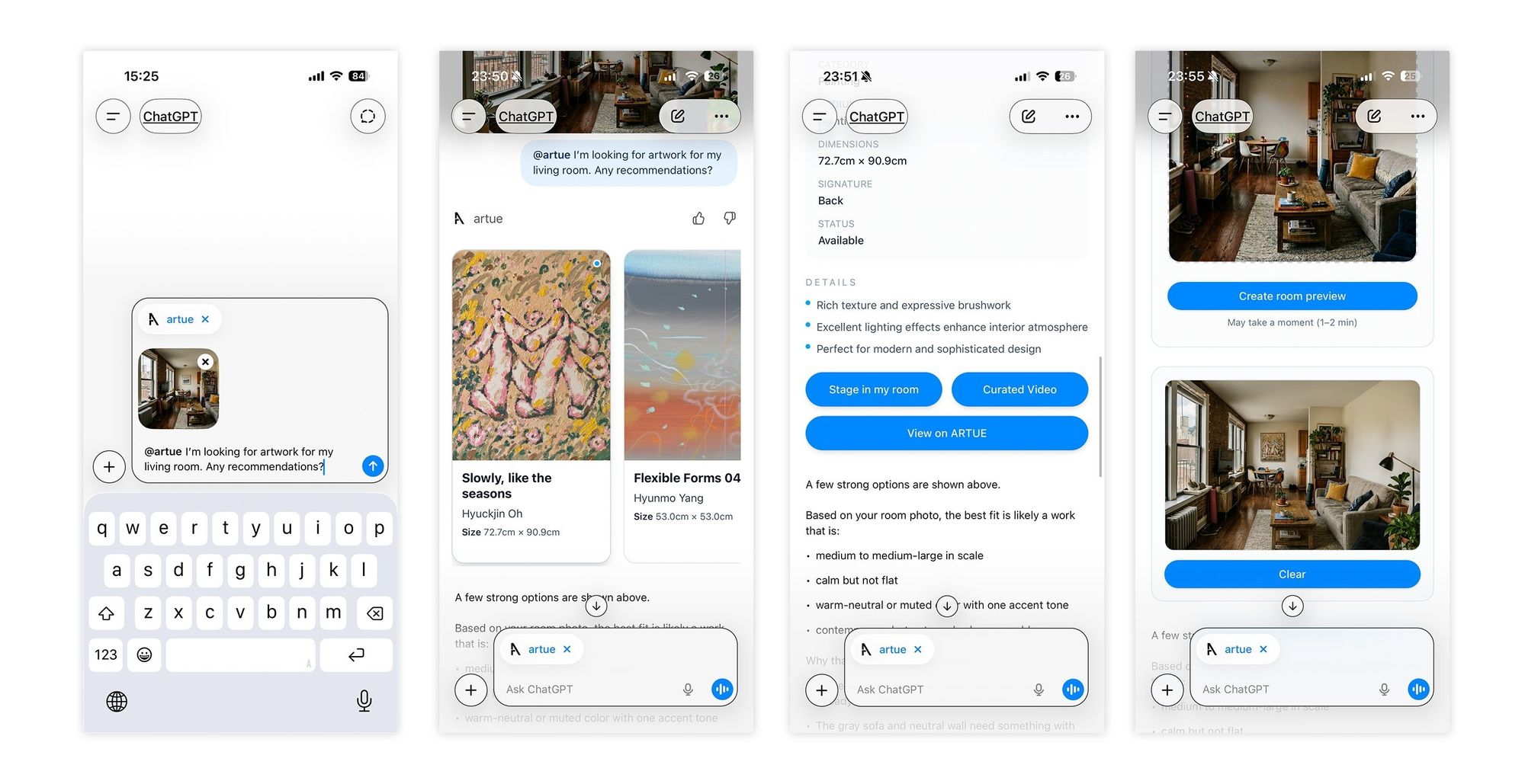 A. Unlike conventional platforms that rely on keyword search or image browsing, Artue uses natural language conversation to interpret users' emotions and aesthetic preferences, recommending works and artists through a contextual, understanding-driven model. The entire process — from discovery to purchase, payment, and delivery — takes place within the ChatGPT interface, with no need to switch applications.