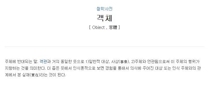 프로그래밍을 하는 이들에게 객체란 정말 너무나도 친숙한 단어다. 하지만 이 객체는 결코 만만하게 볼 단어가 아니다. 지금이야 넘쳐나지만 IT 출판 시장이 막 커지기 시작할 때만해도 볼만한 책은 다 영어 또는 일본어 원서를 번역해 나왔다. 아마 당시 역자들이 가장 번역하기 애매했던 것이 객체가 아니었을까? 포탈에 객체란 단어를 입력하고 났을 때 개발 언어가 뜻하는 객체는 ‘철학 사전’에 명확히 나와 있다. 철학적 풀이를 소프트웨어 개발 관점에서 재해석 하자면 객체란 ‘스스로 속성을 가지고 스스로 움직이는 것’이라 볼 수 있다. 이해가 되는가? 개발을 이제 막 시작한 이라면 어떤 해석을 봐도 모호하긴 마찬가지 일 것이다.