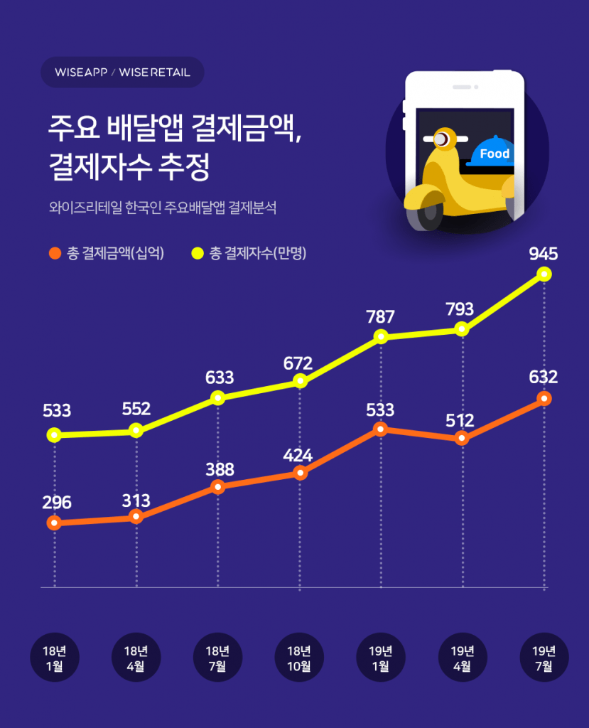 배달앱의 월 결제규모는 6300억원, 결제자는 1000만 시대에 육박했다. 월 결제 금액이 2018년 1월 2960억원에서